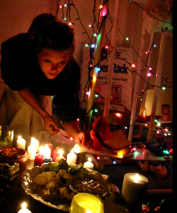 For 3 years in a row we held an experimental holiday event playfully titled 'Crandemoninational Food Riot and Gift Giving Ceremony.' The event was conceived as an intimate event between our closest friends, combining aspects of the 'constructed situation' with a very inter-personal experience. Each event brought different ideas to the table, but a basic structure guided all three. We chose a talisman to represent each attendee, and the event began with a 'finding out' where each participant would either discover which talisman represented them or choose one for themselves. As with all aspects of these events certain rules governed how things proceeded, with, for instance, one year the 'finding out' being enacted as a game of questions while another year the participants choices determining who they ended up seated next to. Each talisman also had an accompanying text, which was normally read aloud before the subsequent feast. We always cooked delicious recipes beforehand and then scripted certain jobs to certain participants, requiring them to cooperate in the course of a successful evening for all. After the conclusion of the feast, candles were lit around the space and the Gift Giving Ceremony commenced. We experimented here as well with various mechanisms of interaction. One year the gift exchange, who gives which gift to who, was randomly assigned through a game. Another year the choices made at the beginning of the evening, in choosing talismans, determined how gifts were exchanged. In all cases we supplied texts at key moments of the interaction, describing the ideas behind the experience. The driving goal of these events was to reinforce the concept of diverse aspects being a necessary part of a powerful community, and the essential need for intimate experience together.